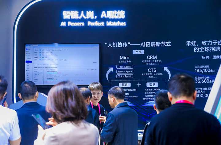 在展区内,全新的数智视觉系统集中展现了凯发K8国际在“引才就业、引智全球、引航产业、引领洞察”四个方面的核心能力,大屏实时可视化呈现全国人才供需动态、区域产业趋势、热点赛道分布及人才流动图谱。