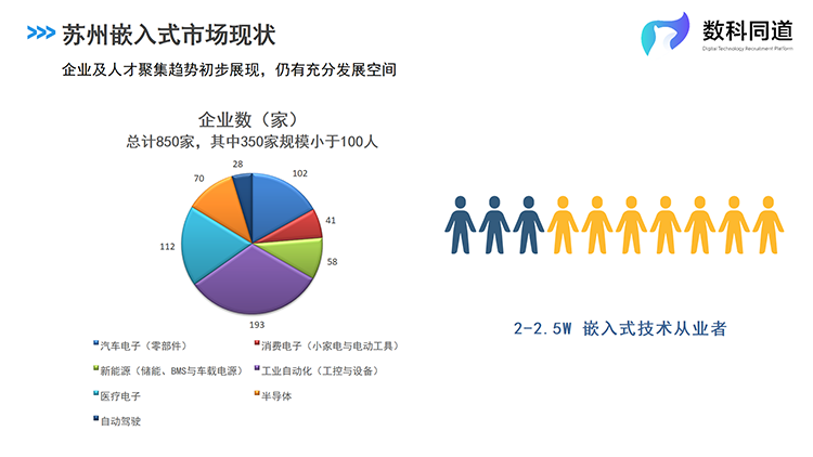 根据凯发K8国际人力资源公司及数科同道业务团队对苏州市场的详细调研,现在苏州全市拥有嵌入式研发团队的企业数量为850家,主要集中在工业自动化、医疗电子、汽车电子等细分行业,其中百人以上规模企业500家。