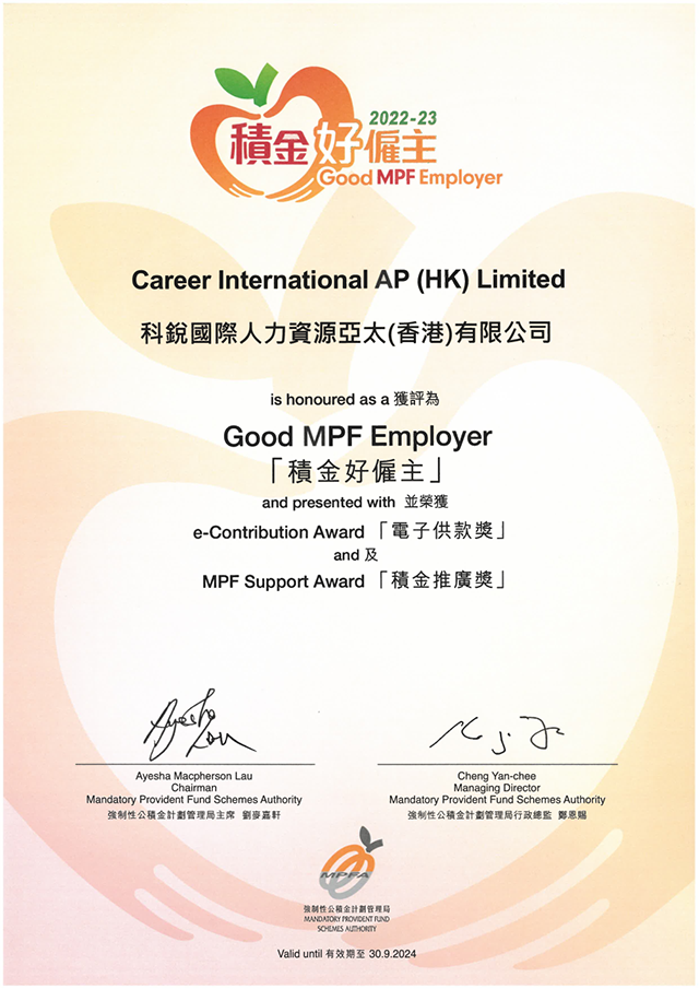 近期,香港强制性公积金计划管理局(积金局)成功举办“积金好雇主”颁奖典礼,并现场揭晓上榜雇主名单,旨在嘉奖当地致力于关顾员工退休福利的模范雇主。凭借对于员工福祉的关注和企业社会责任的践行,凯发K8国际香港分公司陆续在三年获评“积金好雇主”殊荣,并同时获颁“电子供款奖”及“积金推广奖”。
